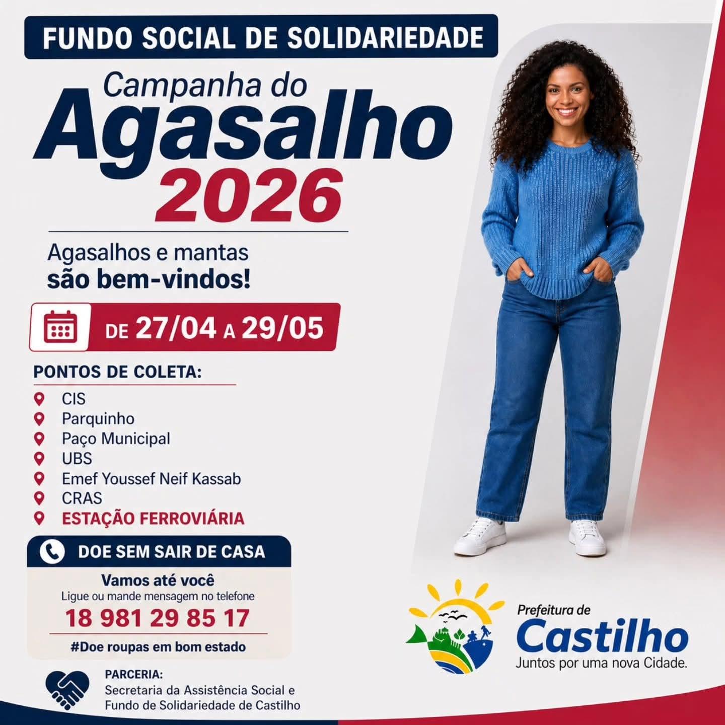 CASTILHO – A Prefeitura de Castilho, por meio do Fundo Social de Solidariedade, deu início à Campanha do Agasalho 2026, com o objetivo de arrecadar roupas, agasalhos e mantas para atender famílias em situação de vulnerabilidade durante o período de frio.