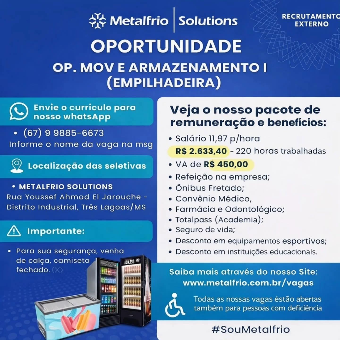 A empresa Metalfrio Solutions está com oportunidade de emprego aberta para o cargo de operador de empilhadeira para trabalhar em Três Lagoas (MS).